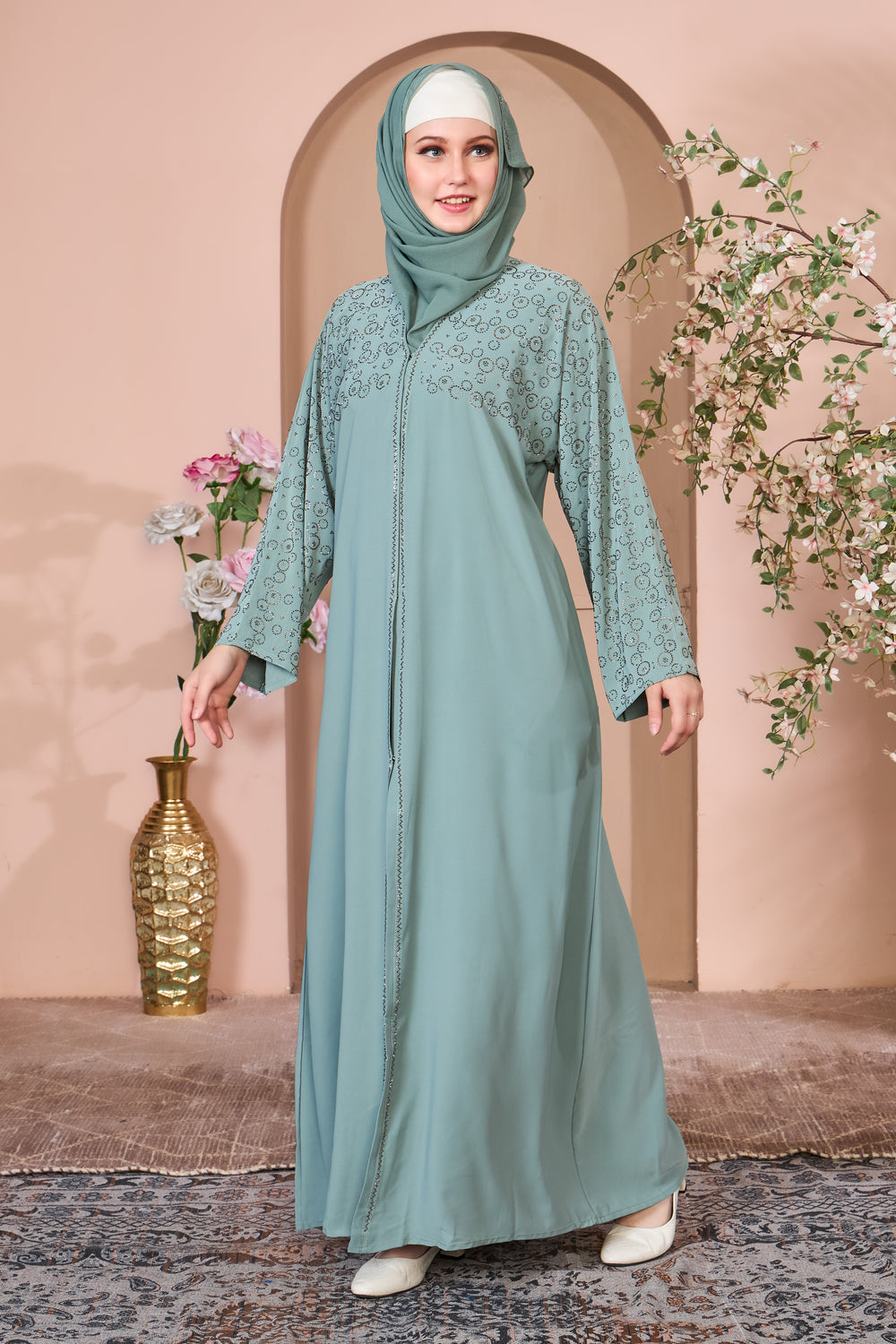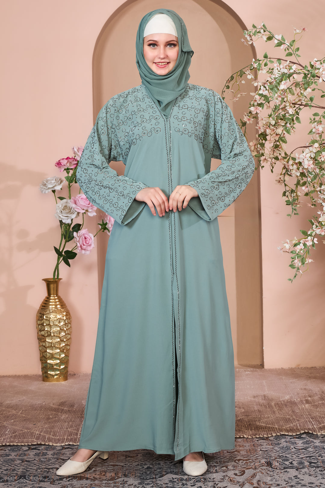 Elegant Teal Abaya with Minimalist Beadwork
