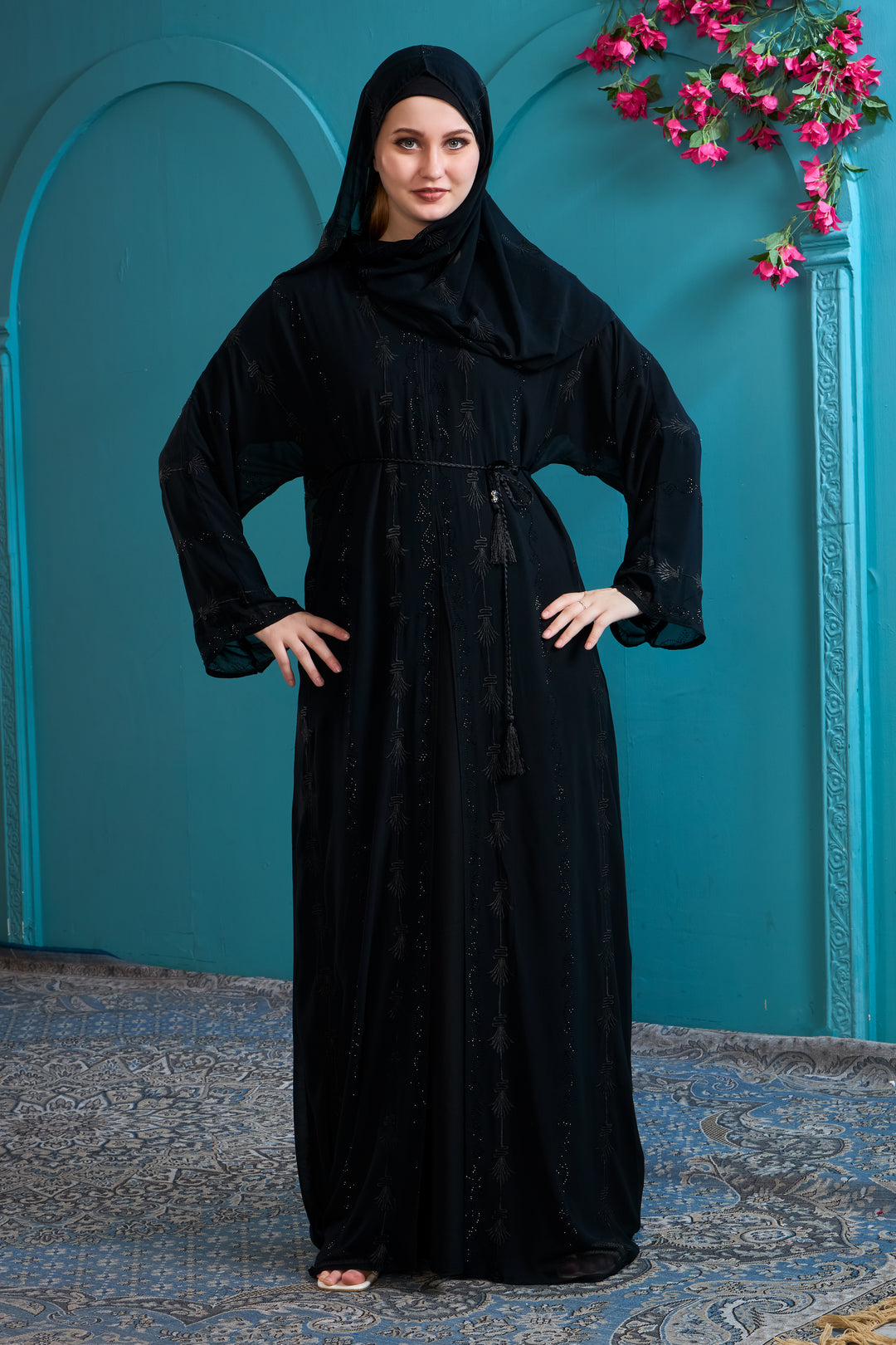 Black Abaya with Beaded Details and Tassel Belt