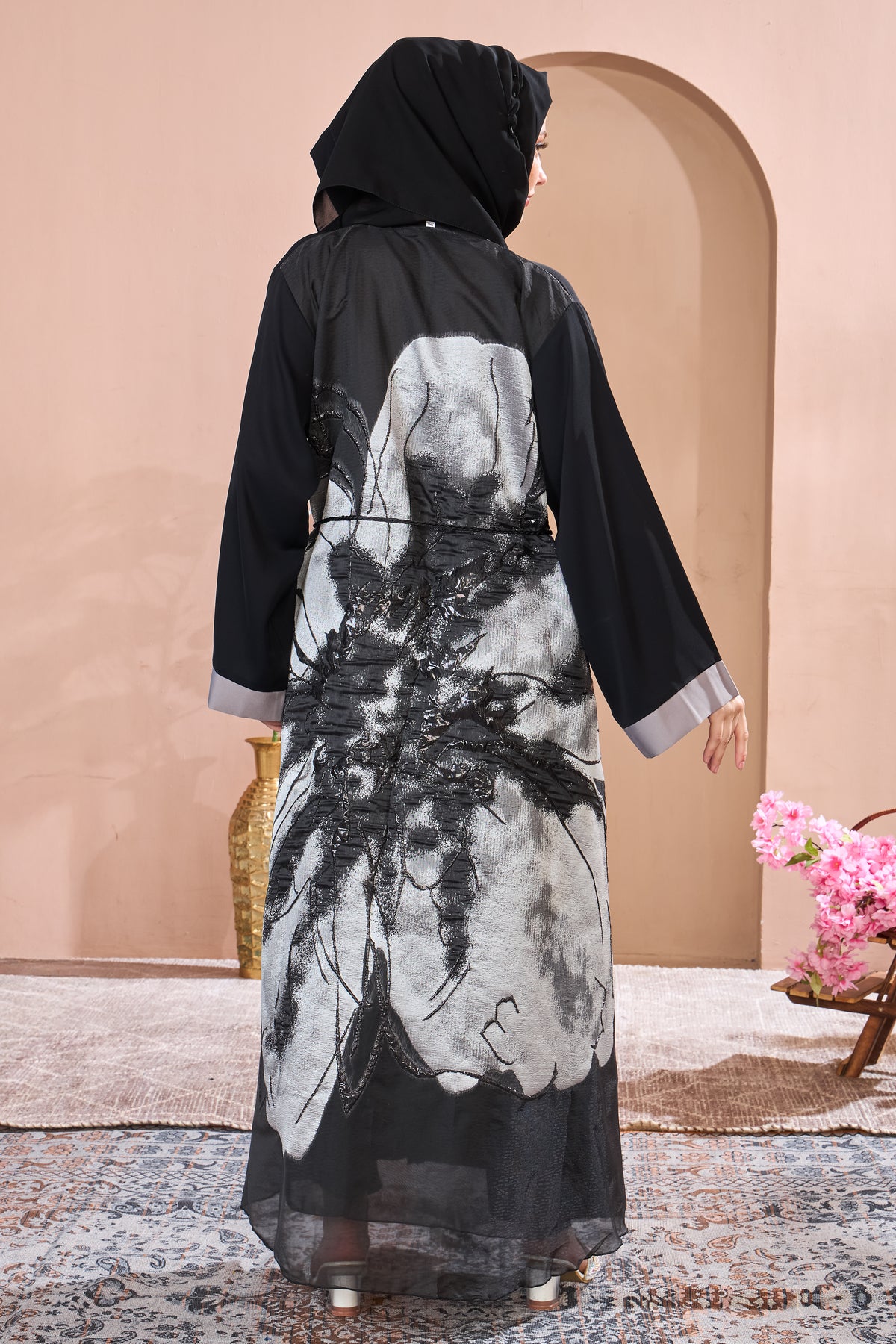 Key Features: Hand-Painted Back Panel: The standout feature is a large, abstract hand-painted design on the back in shades of black, white, and silver, giving the abaya a unique, creative edge.