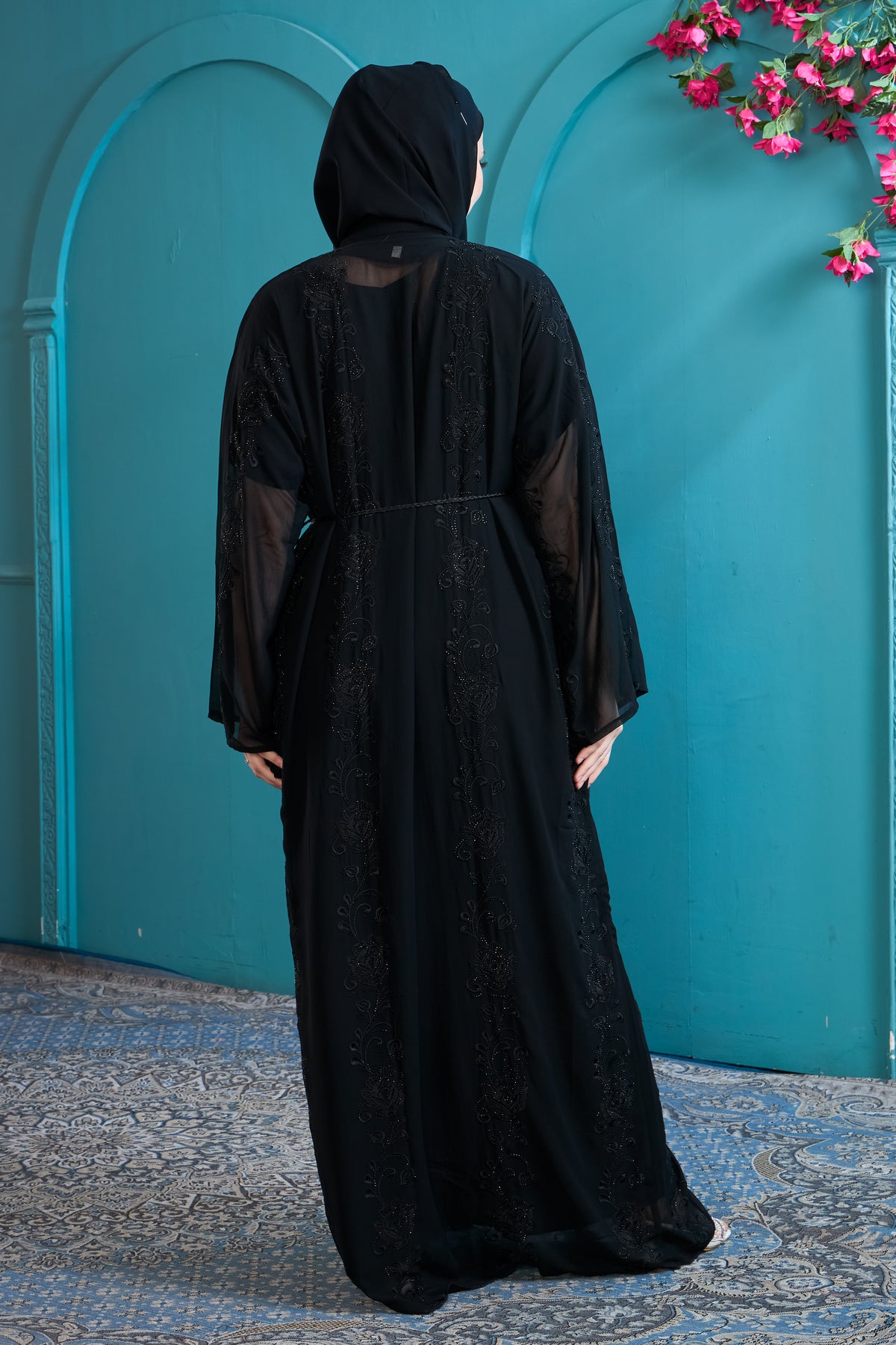This elegant black abaya is a stunning statement piece, combining a classic silhouette with intricate beaded details and a modern tassel belt. It’s perfect for adding a touch of sophistication to any special occasion.
