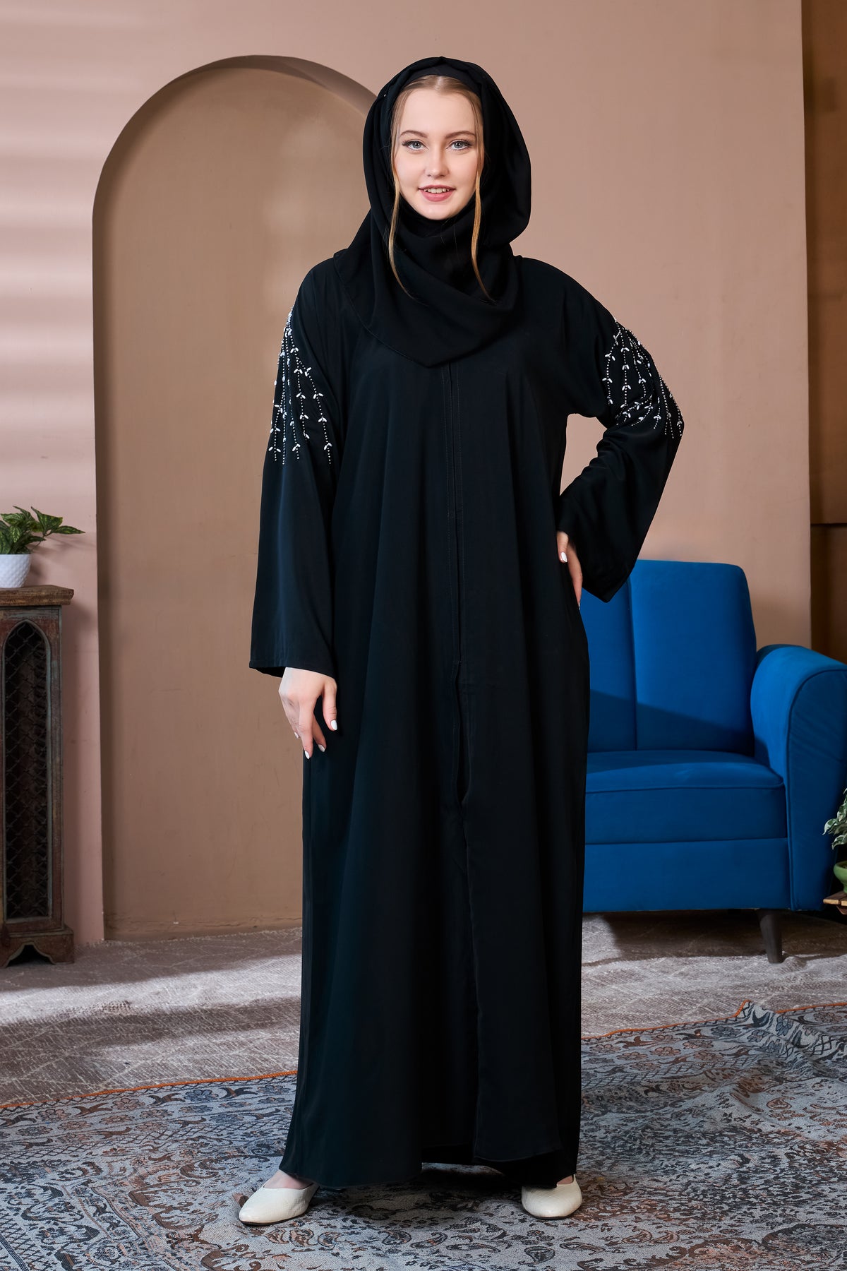 Discover a fresh take on the classic black abaya. This elegant piece is distinguished by its unique and artistic beaded pattern, offering a sophisticated and contemporary look. The beadwork on the shoulders and back creates a striking visual detail that is both modern and graceful.