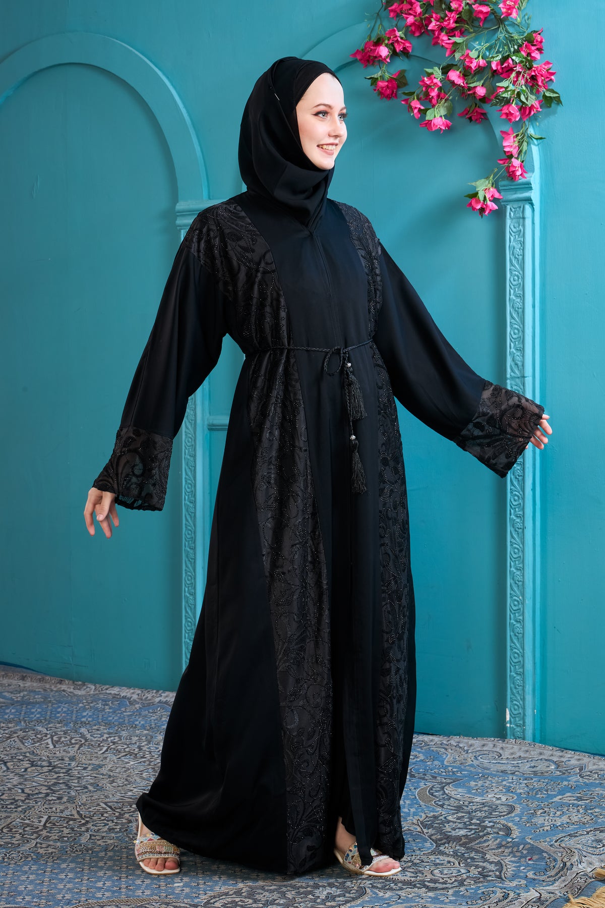 Intricate Lace Panels: The front of the abaya is adorned with wide vertical panels of ornate, embroidered lace, creating a stunning visual and tactile contrast.