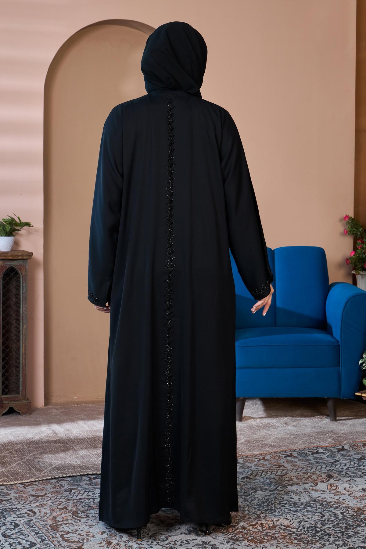 Step into refined elegance with the Ebony Grace Abaya, a timeless classic for the modern woman. Crafted in deep black, it features delicate embroidered beadwork along the front panel and sleeve cuffs, creating a graceful yet understated charm. This versatile piece is perfect for both everyday wear and formal occasions, making it a wardrobe essential.