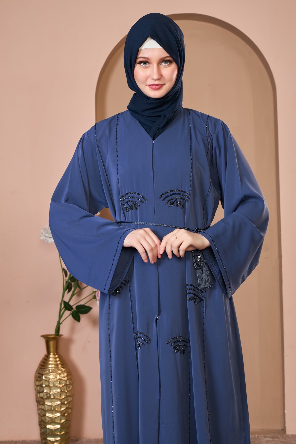 This slate blue abaya offers a unique and sophisticated take on modest fashion. The rich color and intricate beadwork provide a perfect balance of elegance and style, making it an ideal choice for a variety of occasions.