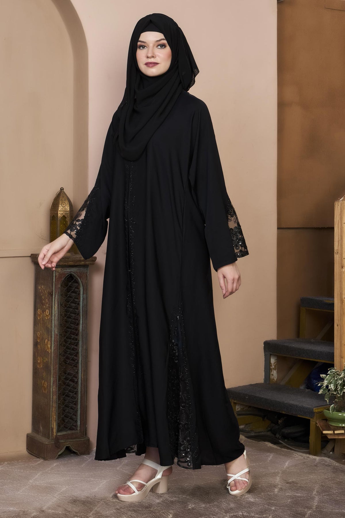 The Noir Lace Abaya is the perfect balance of elegance and sophistication. Designed in rich black fabric, it features delicately embroidered lace sleeves with floral details and a touch of sequins for subtle sparkle. A refined front panel with intricate embroidery adds depth and style, making it an ideal choice for special gatherings and evening occasions.