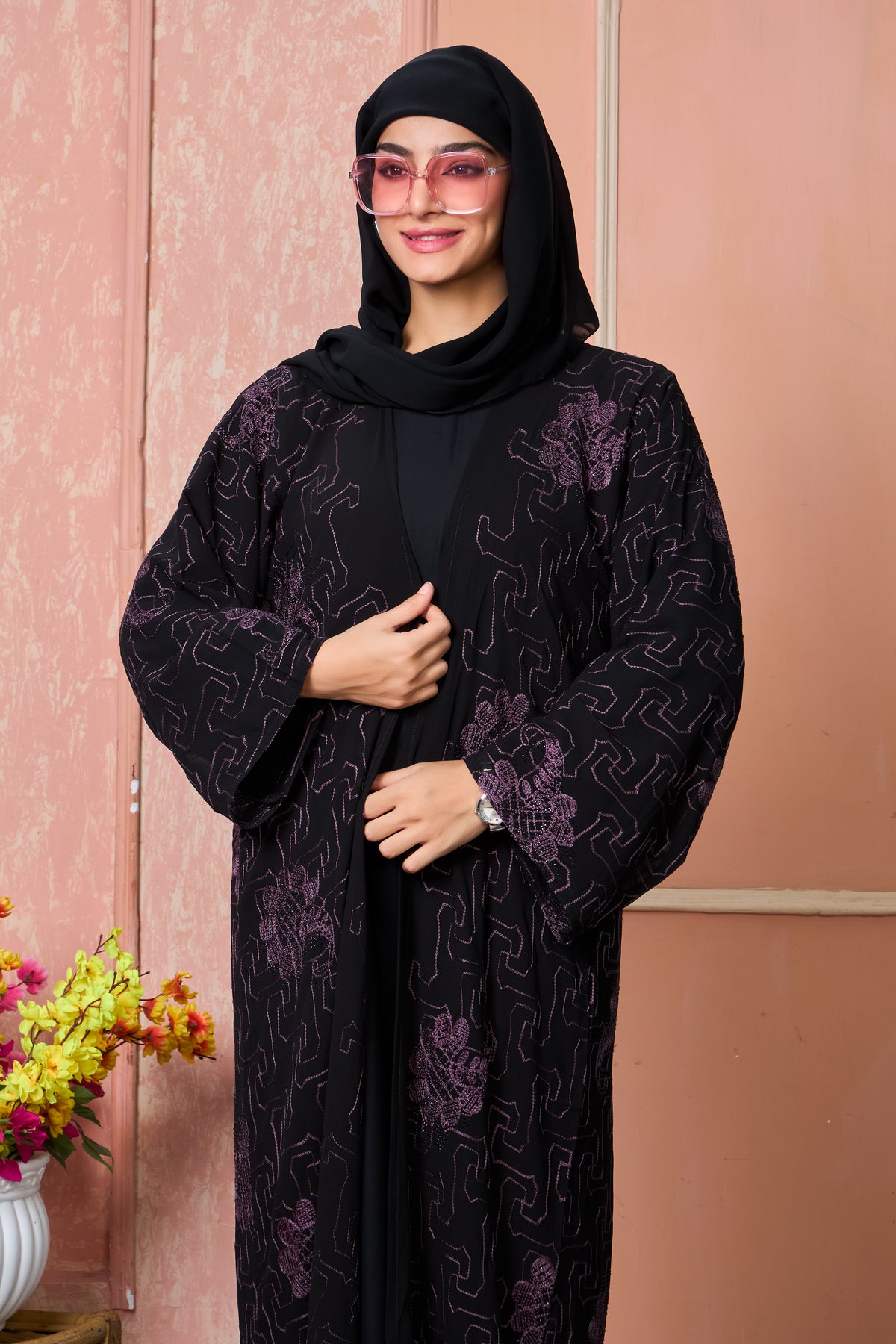 Make a bold yet elegant statement with our Black Open Abaya, featuring intricate purple thread embroidery that blends geometric and floral patterns for a unique design. Crafted from premium lightweight fabric, it offers both comfort and sophistication, making it perfect for special gatherings and everyday elegance.