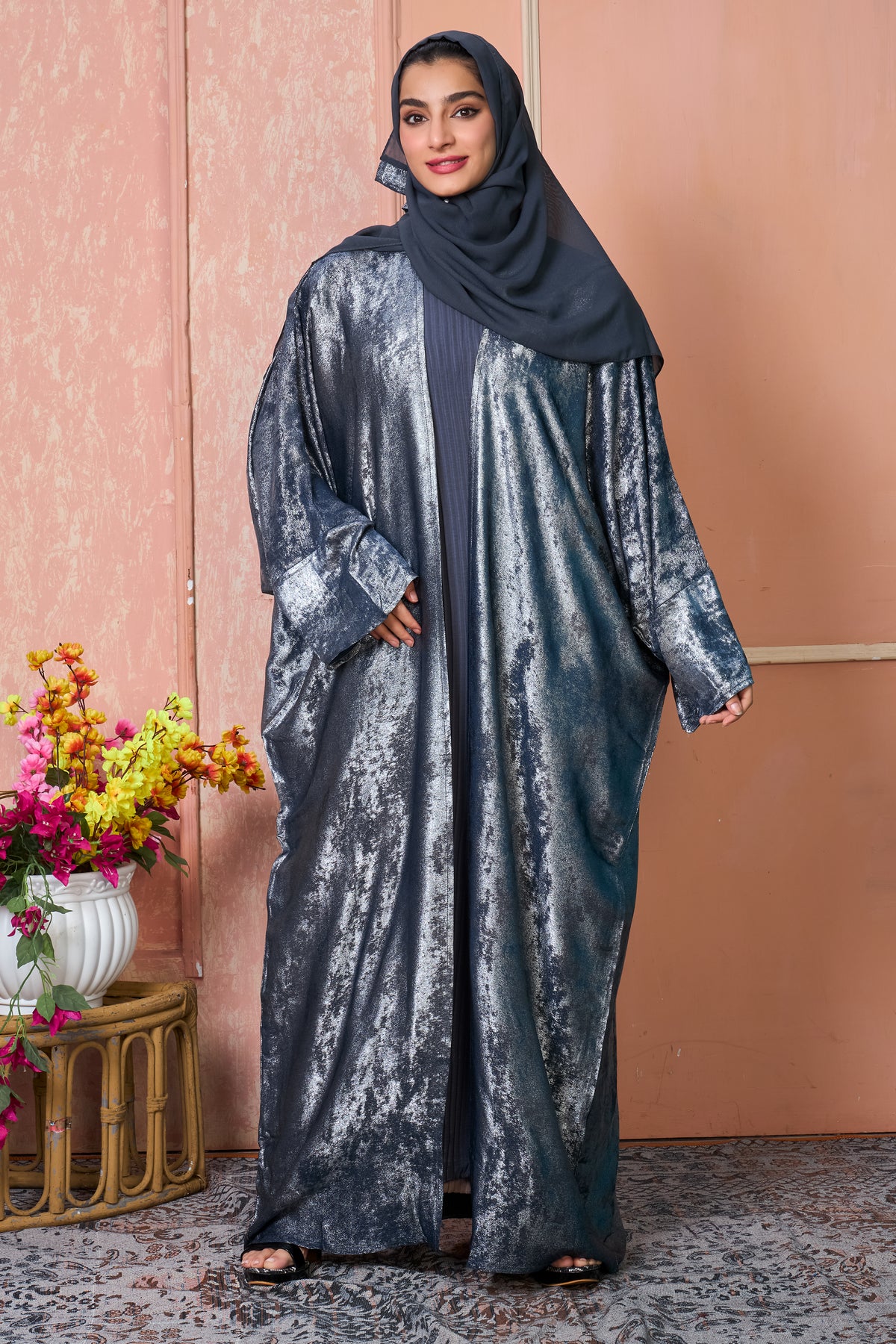Turn heads with our Metallic Silver-Blue Open Abaya, a luxurious piece designed to make a statement. Crafted from shimmering textured fabric, this abaya blends modern glamour with modest sophistication, perfect for evening events and special occasions.