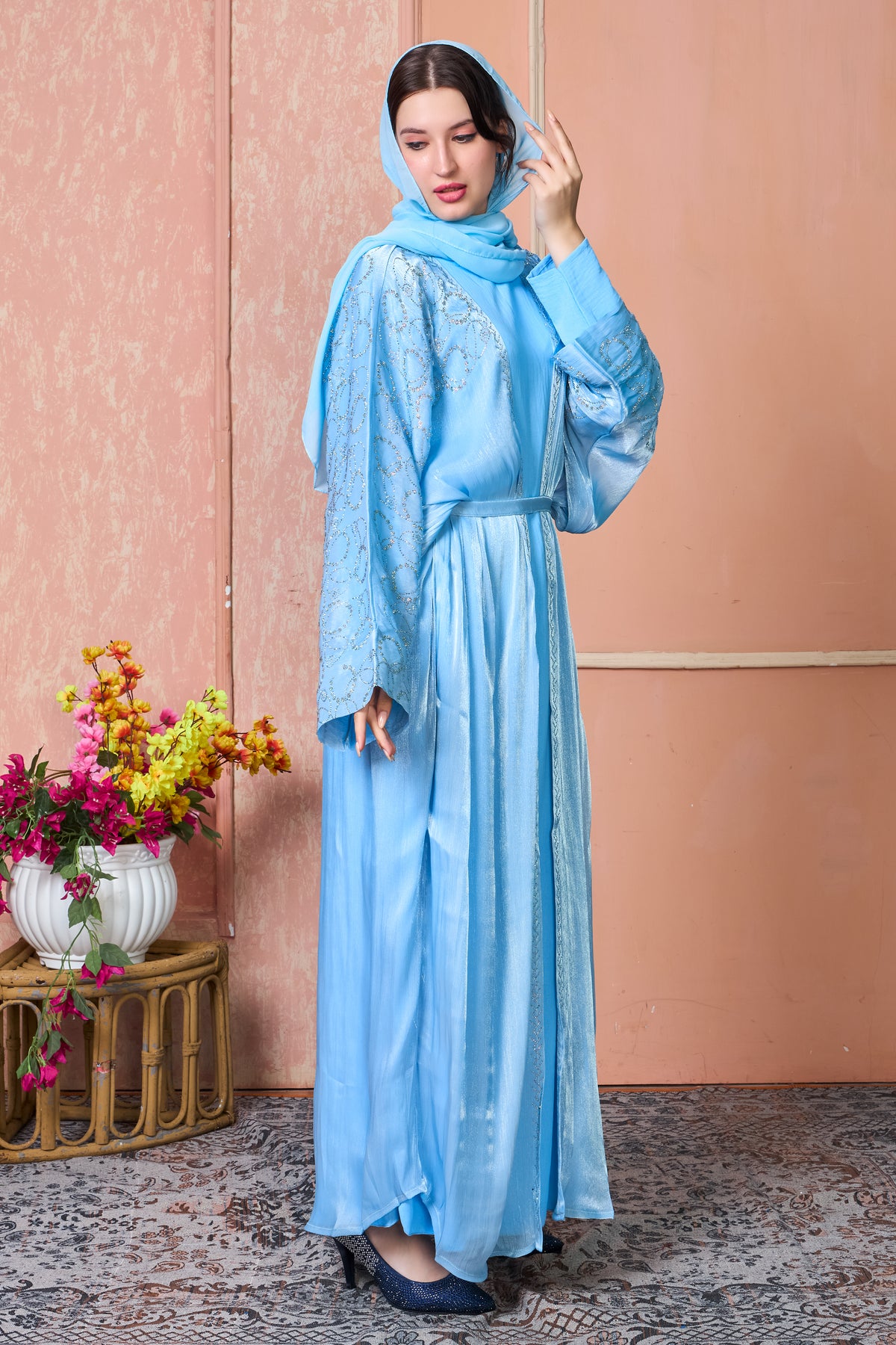 Complete Set: Comes with a matching sky blue inner dress and hijab for a coordinated, ready-to-wear look.