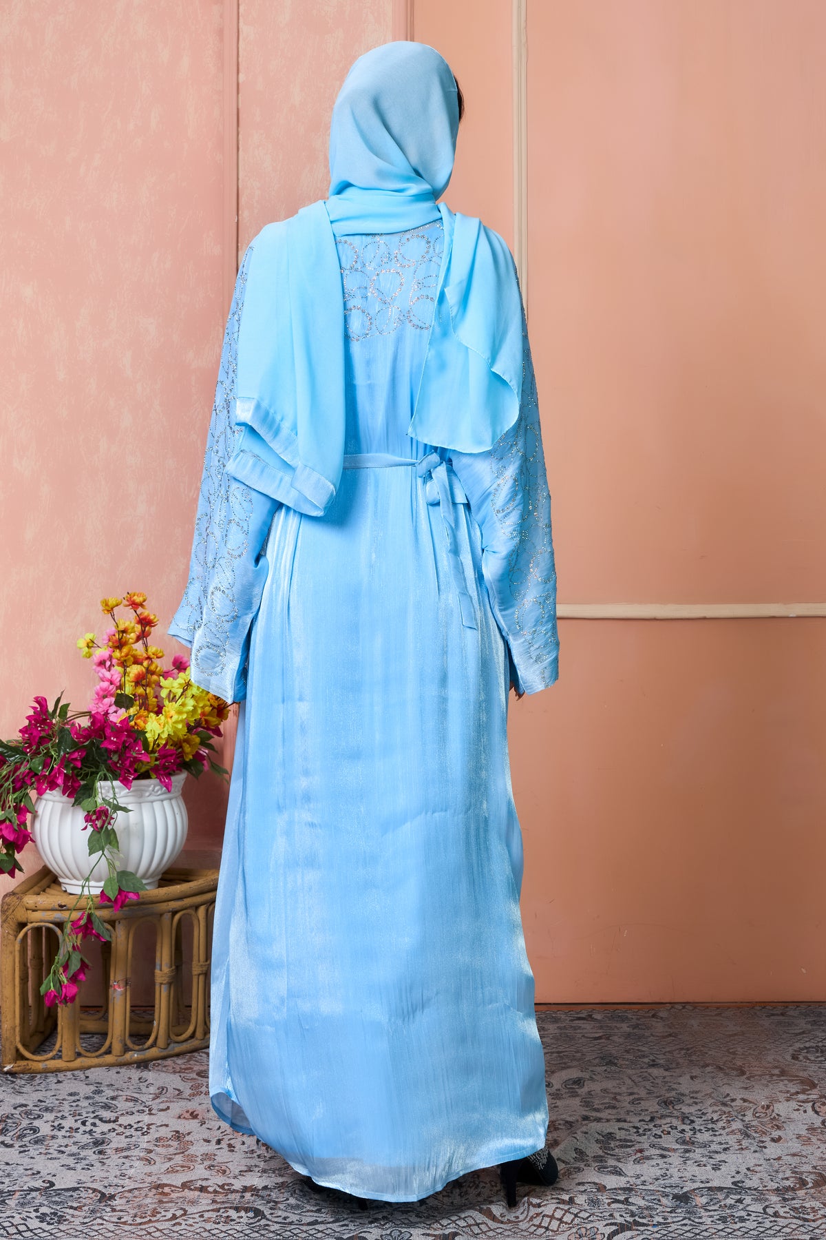 Add a refreshing pop of color to your modest wardrobe with our Sky Blue Stone Work Open Abaya, a graceful blend of elegance and comfort. Crafted from lustrous lightweight fabric, it features delicate silver stone embellishments in an intricate circular pattern, giving it a sparkling, luxurious appeal perfect for special occasions and festive gatherings.