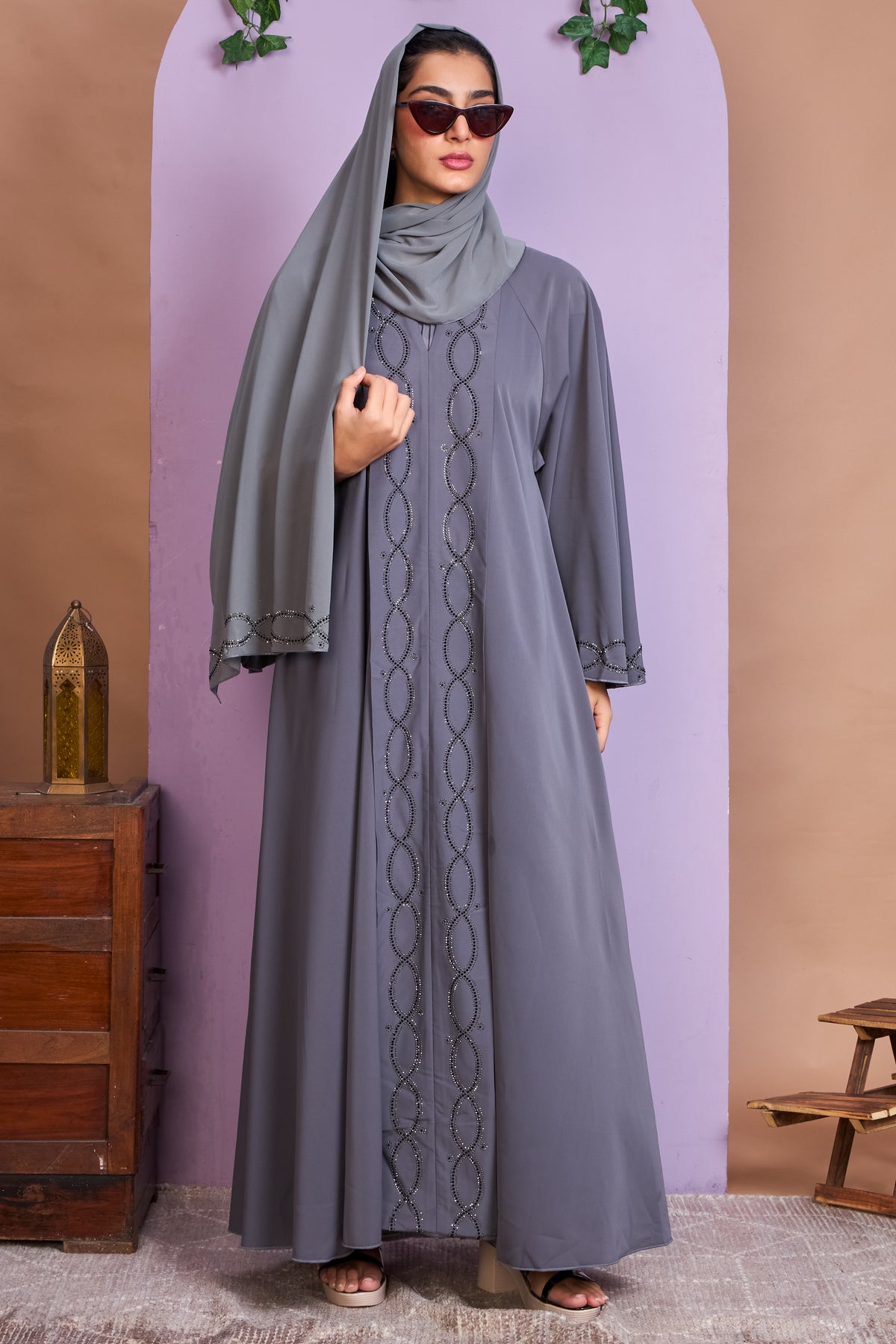 Elevate your modest wardrobe with this chic ash grey abaya, designed with intricate black stone loop embellishments along the front panel and sleeves. The elegant wave-like pattern adds depth and sophistication to the minimalist silhouette, making it perfect for both casual outings and special occasions.