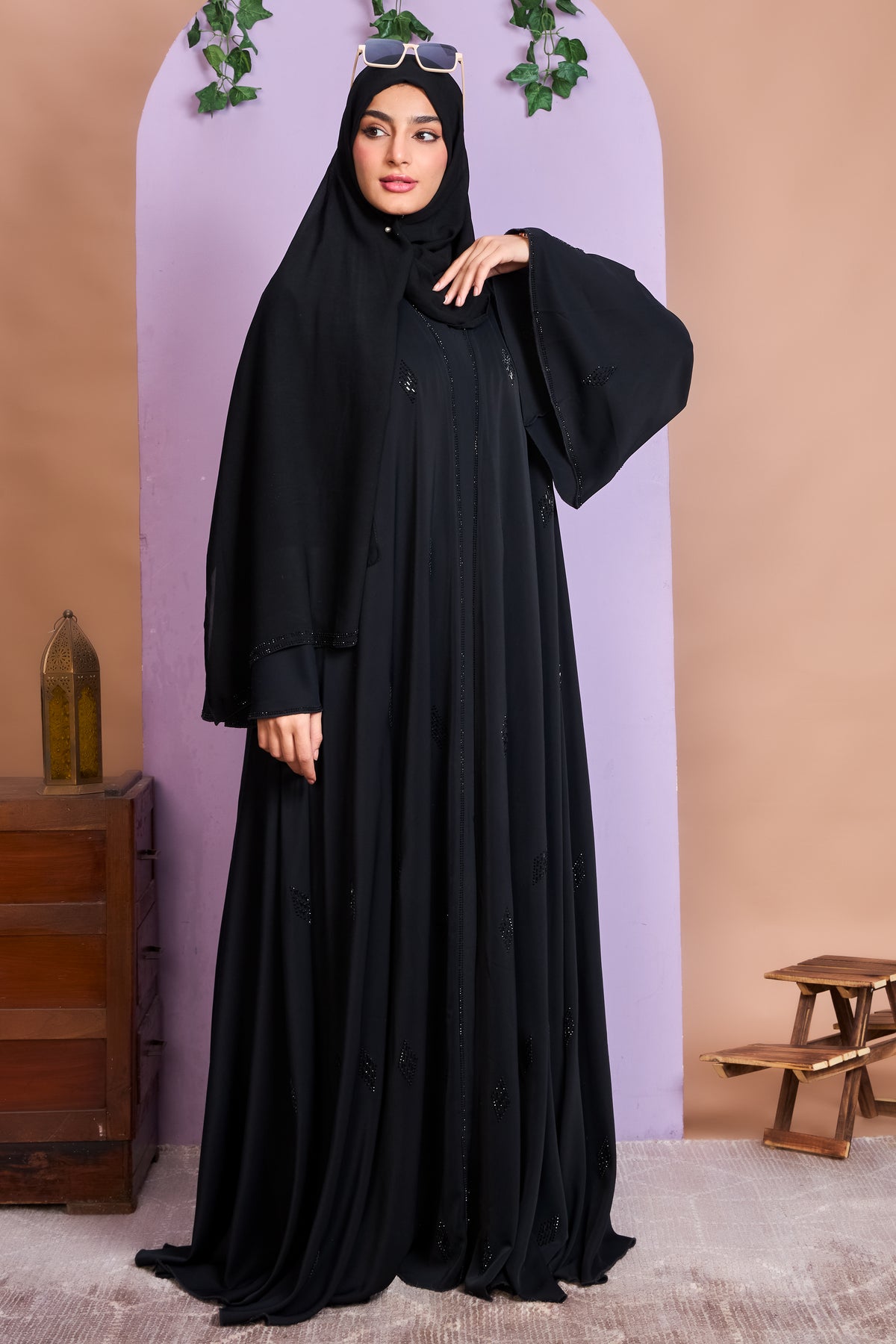 Classic elegance meets contemporary charm in this black umbrella abaya featuring subtle diamond-shaped black stone embellishments. With its wide flare and clean silhouette, this abaya offers a flattering, flowy look that moves with grace. The minimal yet striking detailing adds just the right amount of sparkle for both everyday wear and semi-formal occasions.