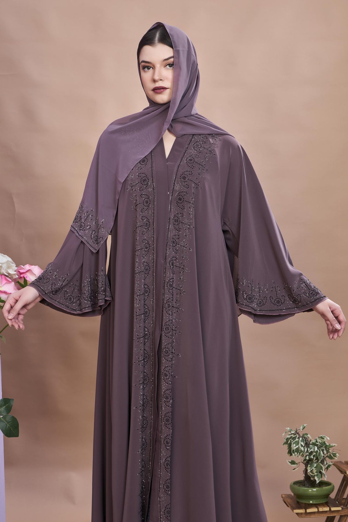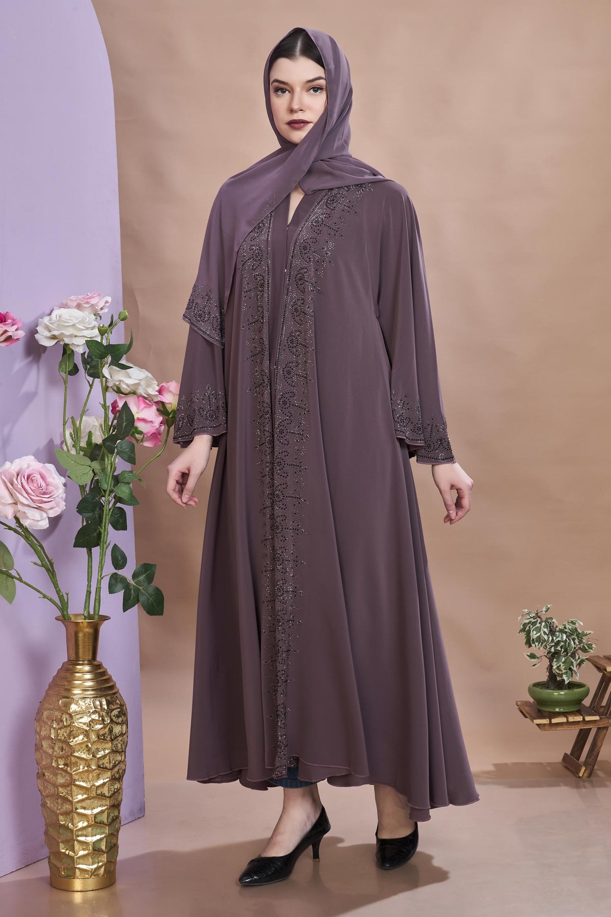 Step into timeless elegance with this beautifully designed umbrella abaya, crafted for the modern woman who values both modesty and style. The rich mauve shade adds a royal charm, while the umbrella cut flows gracefully, offering a flattering silhouette and ease of movement. Perfect for formal occasions, gatherings, or special evenings, this abaya combines sophistication with subtle glamour.