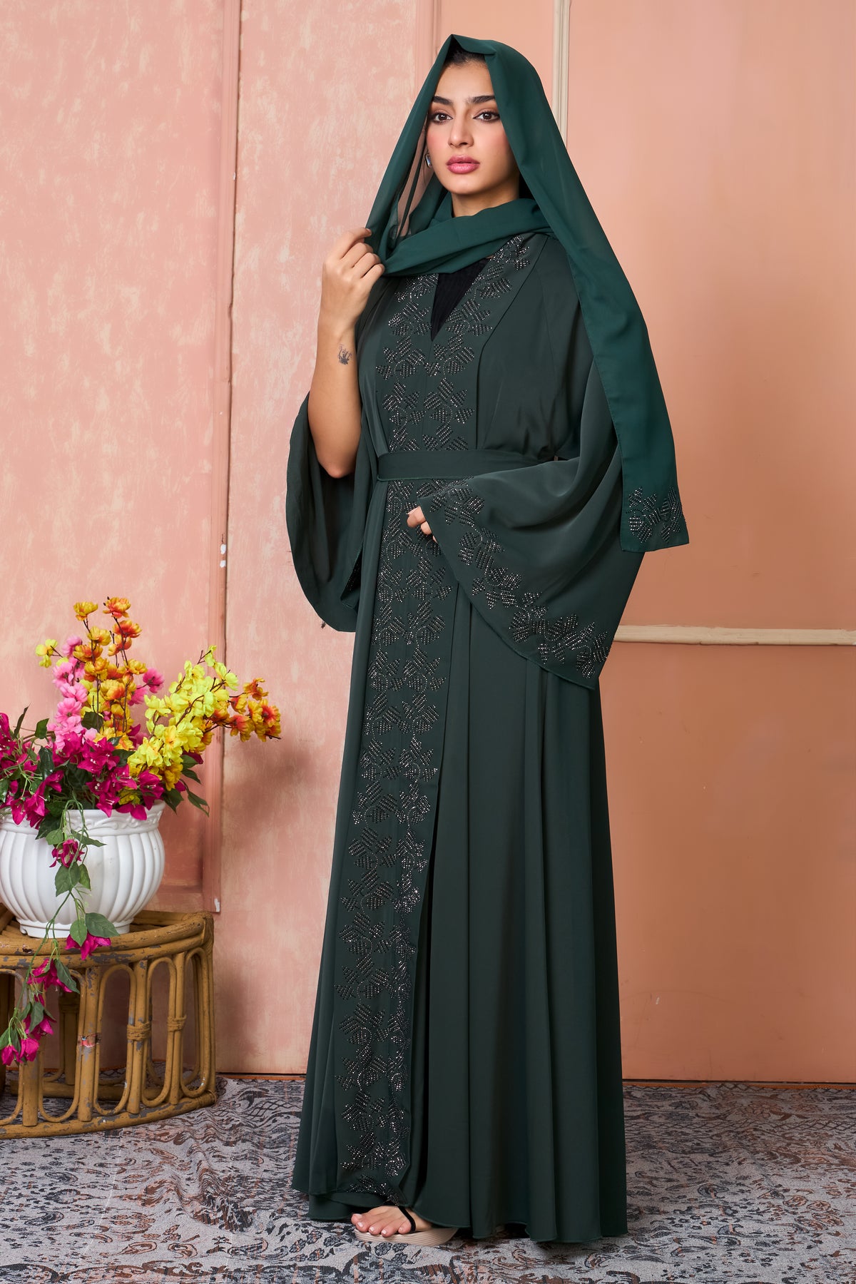 Drape yourself in timeless elegance with the Emerald Noir Embellished Abaya. Crafted in a rich emerald green hue, this abaya features intricate black stone embellishments in a geometric motif that runs down the front and sleeves, offering a graceful blend of modern style and traditional charm. The flared sleeves and fluid drape add to its statement appeal.