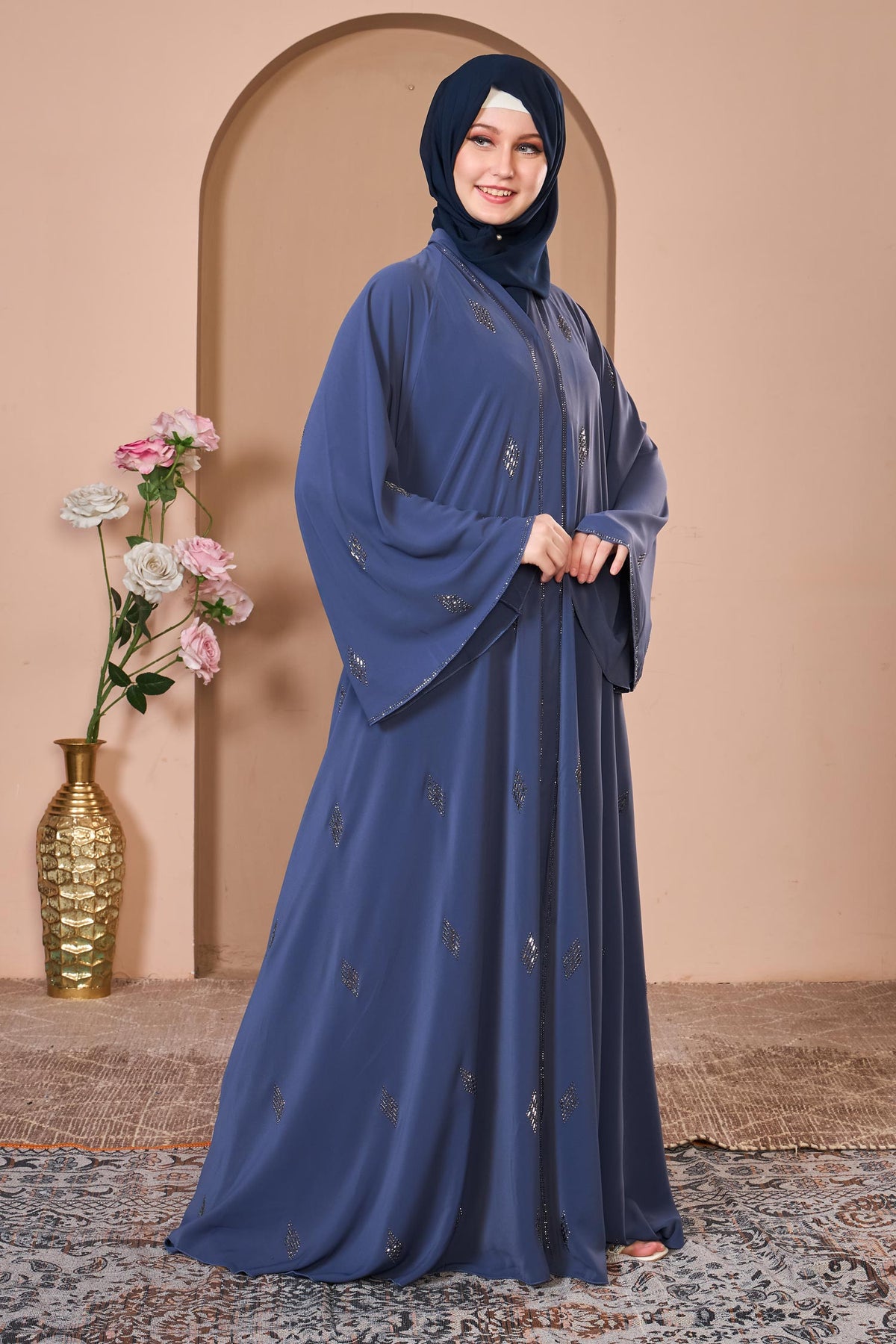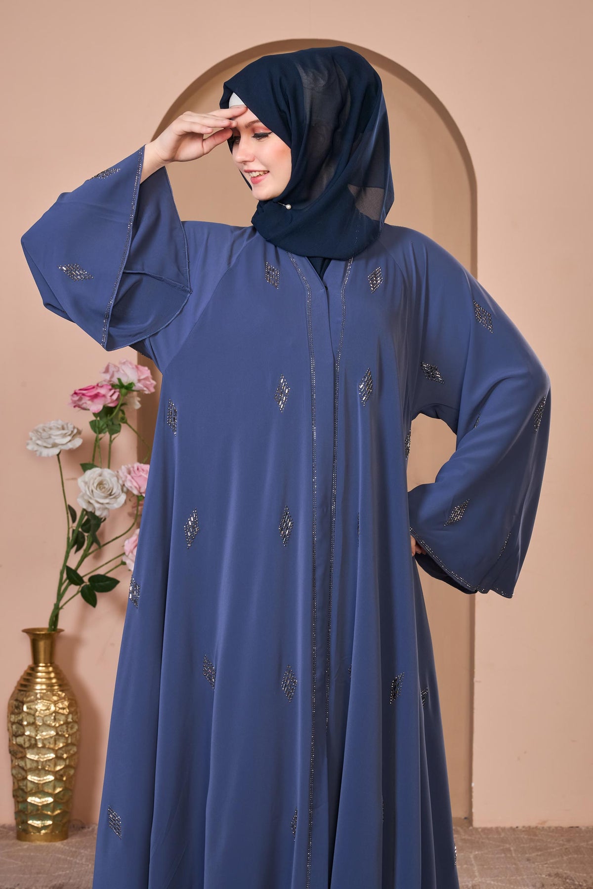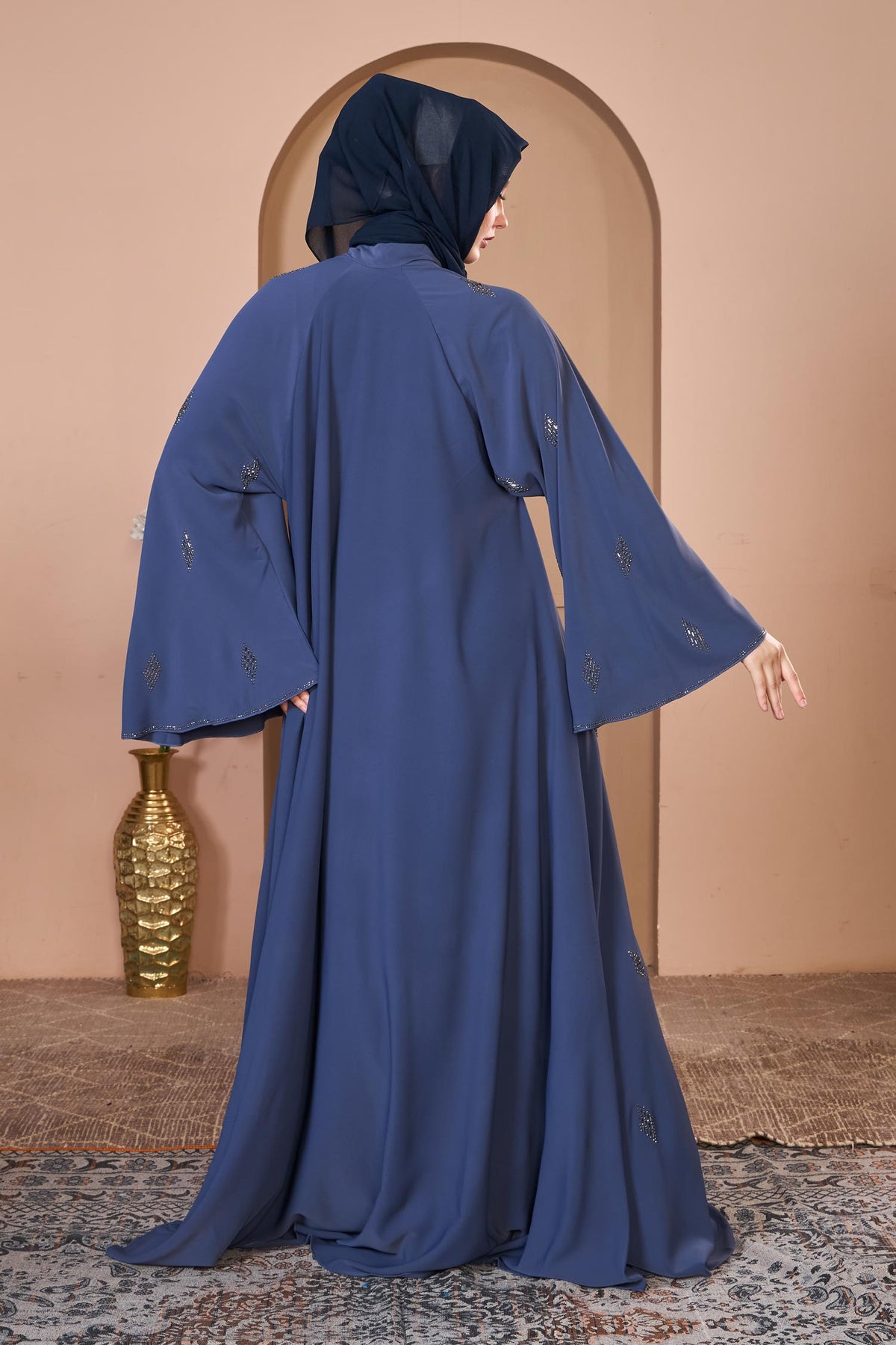 Add a touch of sophistication to your wardrobe with this navy blue abaya, beautifully detailed with scattered embellishments for subtle sparkle. The flared sleeves and flowing cut create a graceful silhouette, making it perfect for both special occasions and refined everyday wear. Elegant, versatile, and modest — this abaya is a timeless addition to your collection.